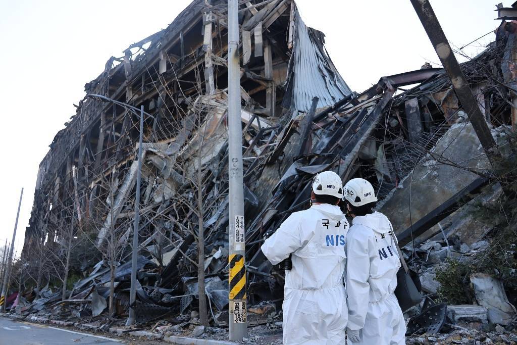 当地时间2025年11月21日,韩国忠清南道天安市,消防、警察、国立科学搜查研究院等联合调查组人员对时尚物流中心火灾现场进行调查。视觉中国图