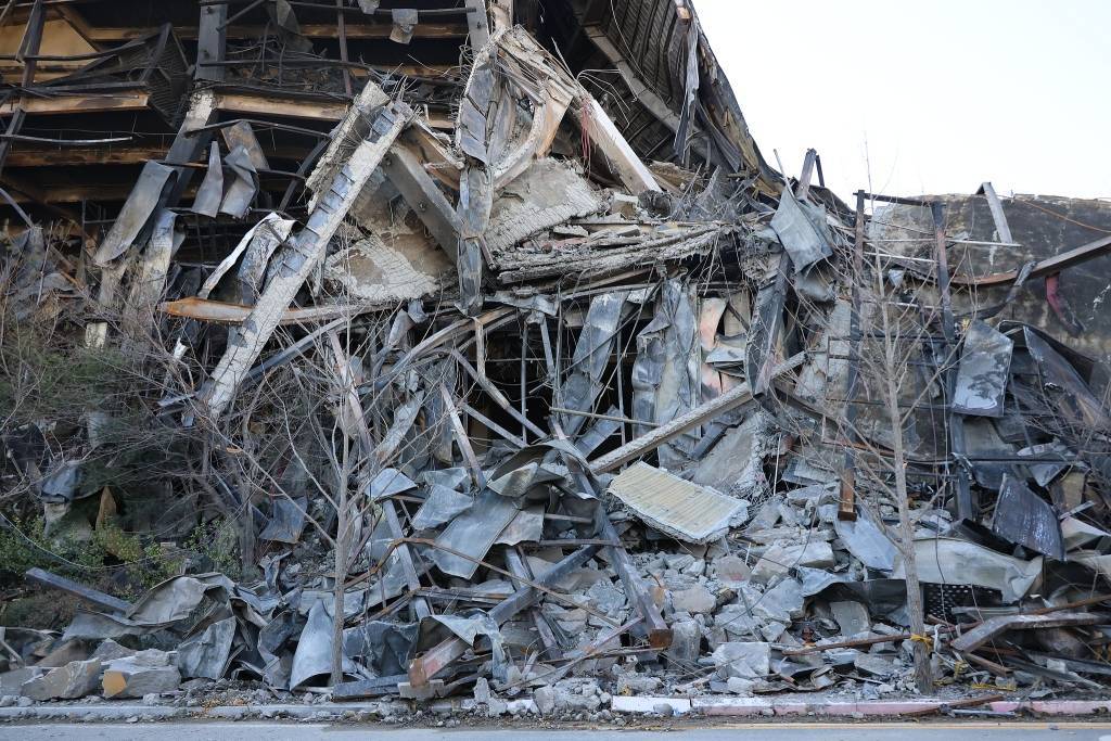 当地时间2025年11月21日,韩国忠清南道天安市,衣恋集团(E-LAND)时尚物流中心发生火灾后,建筑残骸散落在人行道上。视觉中国图