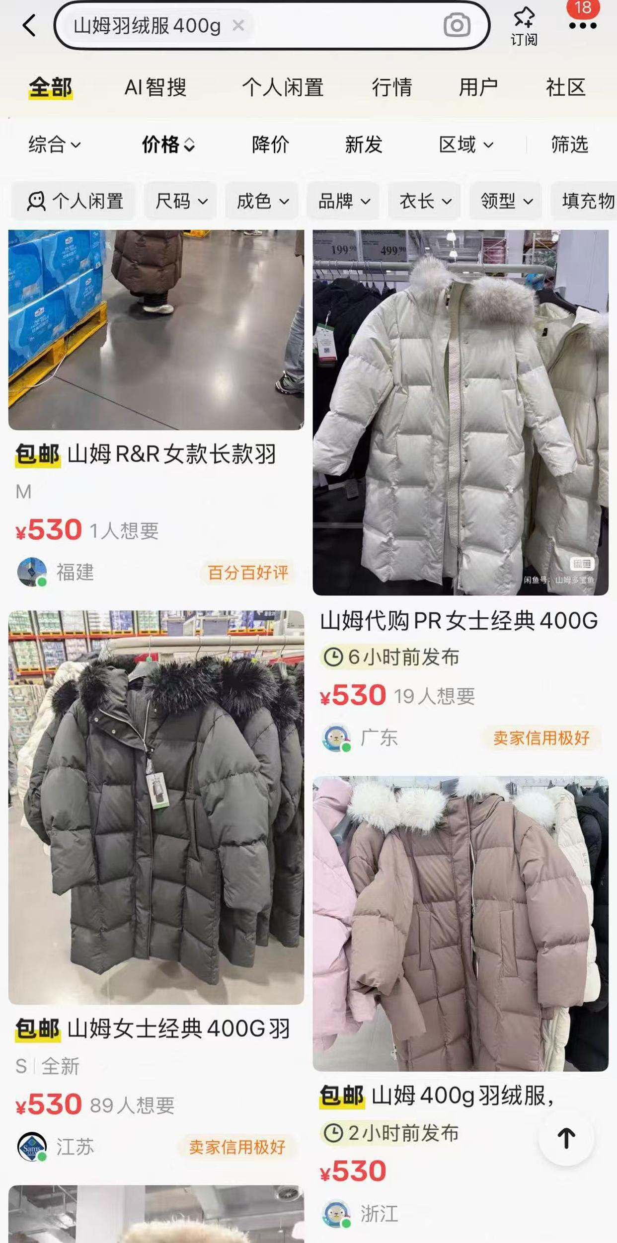 近期,山姆会员超市售价499元充绒量达400克的羽绒服卖爆,不少网友购买后在社交平台分享体验,更有不少人在二手平台加价出售。