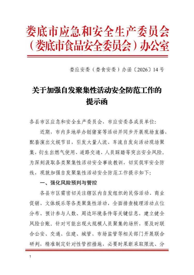 1月19日下午,应急管理部的官方微信公众号发布《杀猪宴破圈,“流量凌驾安全”怎么治?》一文,文中提到湖南省娄底市应急和安全生产委员会(娄底市食品安全委员会)办公室紧急发布《提示函》,直指直播引流引发的聚集性风险,从风险预判、重点防控、应急保障、宣传引导、责任压实五大维度划定刚性要求。