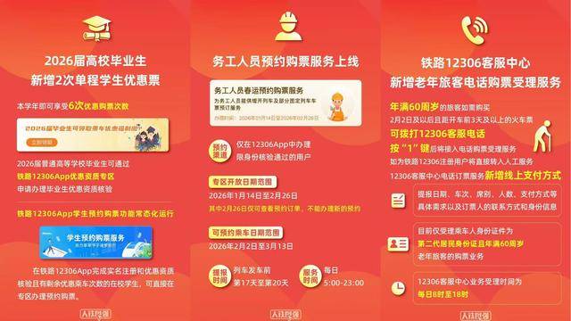 为2026届高校毕业生异地求职增加2次优惠购票次数,继续为学生、务工人员提供预约购票服务。铁路12306客服中心新增60周岁及以上老年人电话购票受理服务。