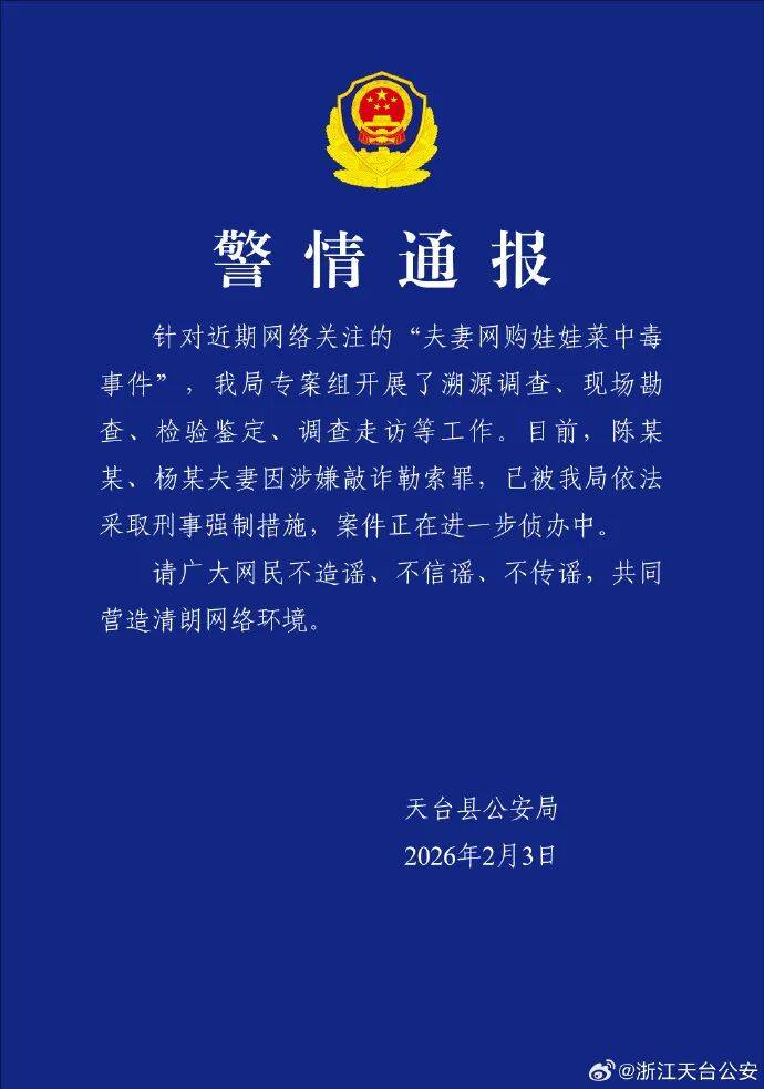 针对近期网络关注的“夫妻网购娃娃菜中毒事件”,该局专案组开展了溯源调查、现场勘查、检验鉴定、调查走访等工作。目前,陈某某,杨某夫妻因涉嫌敲诈勒索罪,已被该局依法采取刑事强制措施,案件正在进一步侦办中。