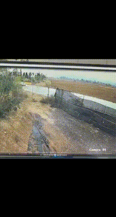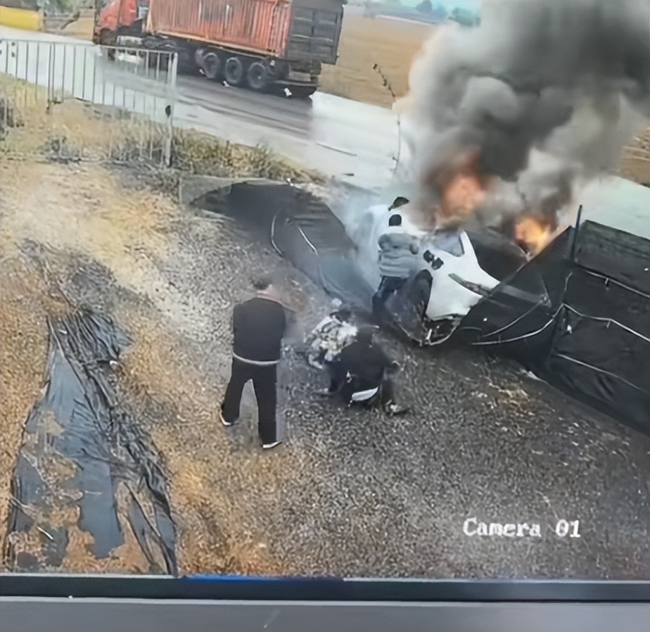 监控视频显示,周围都是田野,道路周围几乎没有建筑。中午11时59分,一辆白色轿车疑似失控,撞向路旁的护网。11时59分41秒,主驾驶位司机打开车门下车,车身开始冒起黑色烟雾。